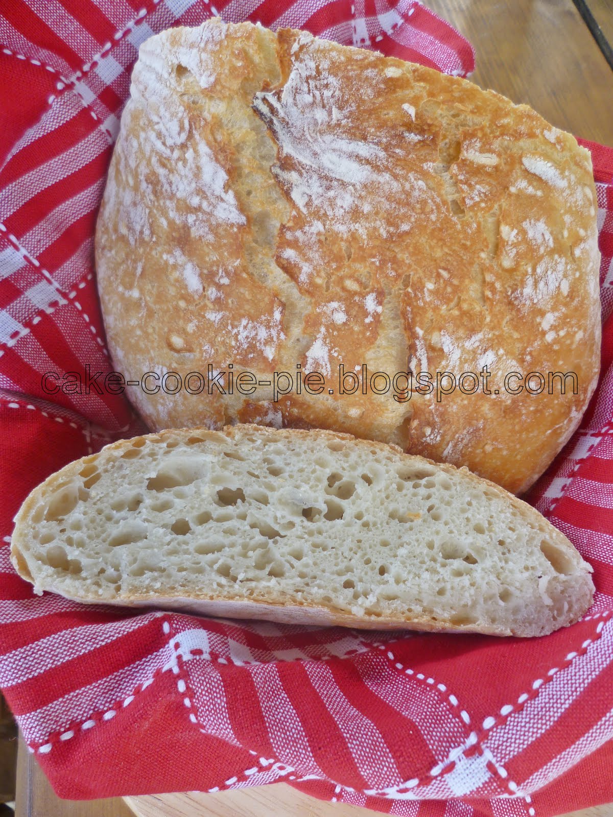 U većoj zdjeli pomiješajte brašno, sol i kvasac. Dodajte toliko vode da zamijesite tijesto vilicom, otprilike 320 do 350 ml. Zdjelu pokrijte prijanjajućom folijom i pustite na sobnoj temperaturi 12 sati ili preko noći. Ujutro na pobrašnjenu površinu istresite tijesto. Tijesto je jako mekano pa uz pomoć plastične špatule preklopite lijevi i desni kraj prema sredini. Tako formirano tijesto prebacite na pobrašnjenu krpu i sve zajedno stavite u košaricu (ili zdjelu). U pećnicu stavite posudu zajedno s poklopcem (vatrostalnu, emajliranu ili inox) i zagrijte na 230°C. Kad se pećnica zagrije, izvadite posudu, otklopite i preokrenite u nju tijesto (posudu nije potrebno namastiti i ne morate koristiti papir za pečenje). Poklopite posudu i vratite u pećnicu na 30 minuta. Zatim skinite poklopac i pecite još 20 minuta. Pečeni kruh umotajte u krpu i pustite na rešetki da se ohladi.