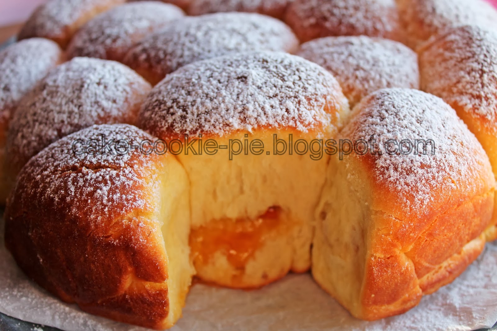 Biti ću iskrena pa ću priznati da je za ovu priliku tijesto zamijesio i dignuo pekač za kruh. Ukoliko sve to radite ručno, u većoj zdjeli pomiješajte brašno s kvascem. Dodajte mlijeko, vodu, šećer, sol, jaje i žumanjke pa zamijesite tijesto. Tijesto oblikujte u kuglu, stavite u pobrašnjenu zdjelu, pokrijte prijanjajućom folijom i pustite da se digne. Dignuto tijesto premijesite i razvaljajte na prst debljine. Narežite na pravokutnike i na svakog stavite žličicu nadjeva. Formirajte loptice koje stavite u kalup za tortu obložen papirom za pečenje. Površinu tijesta premažite rastopljenim maslacem. Kalup pokrijte prijanjajućom folijom i pustite da se diže otprilike pola sata. Odstranite foliju pa pecite otprilike 30 minuta u pećnici zagrijanoj na 180ºC, dok ne poprime lijepu boju. Prije posluživanja pospite šećerom u prahu.