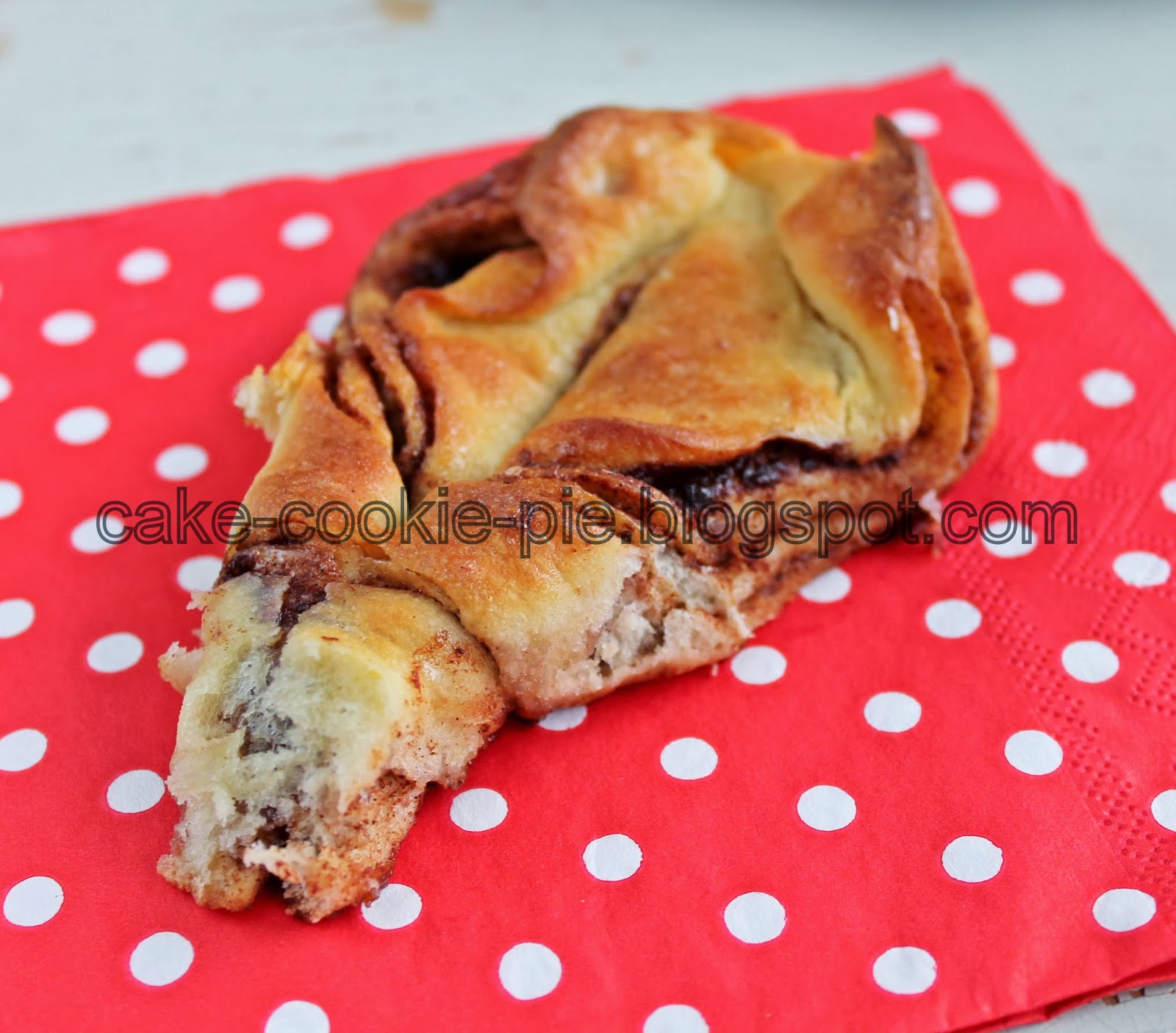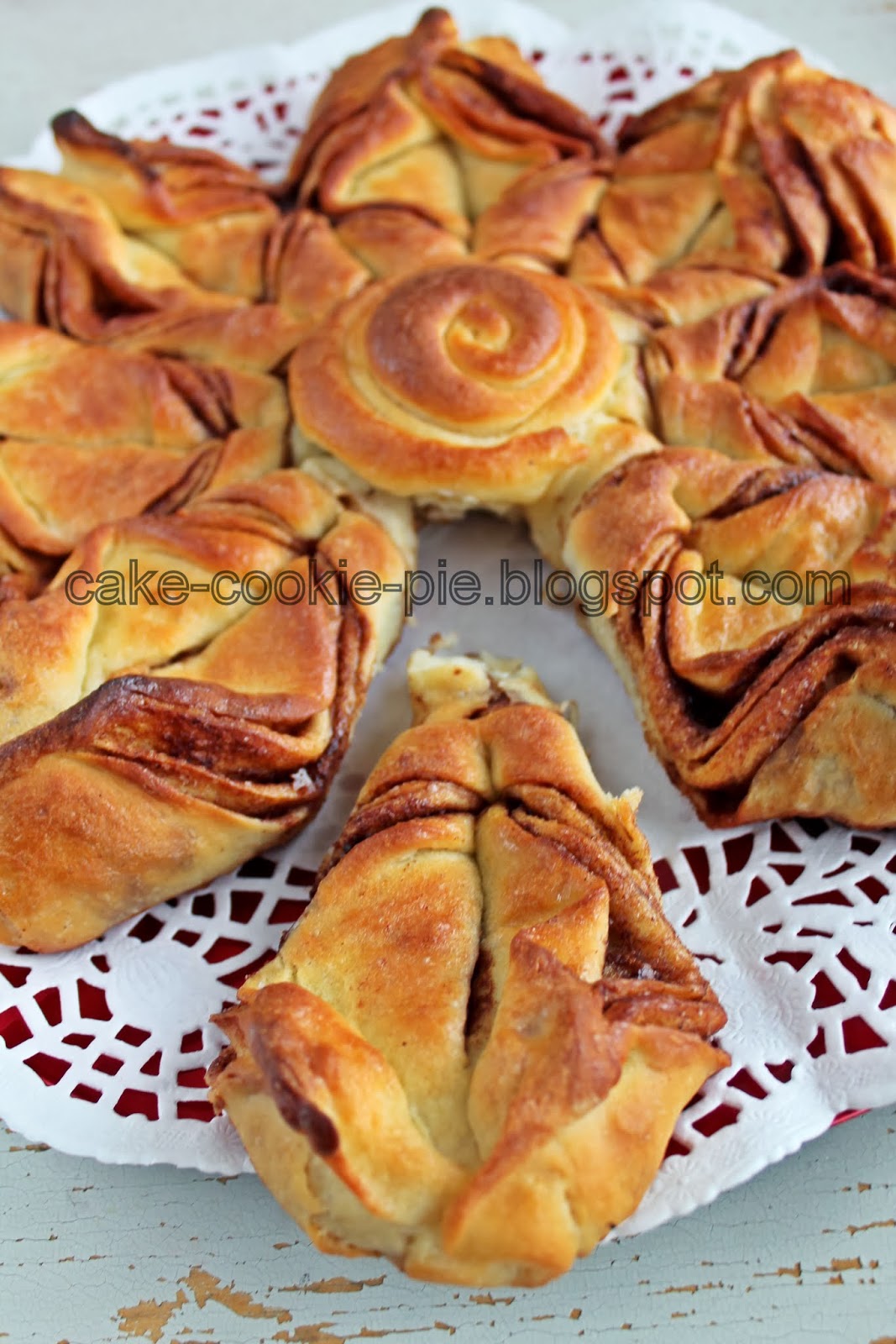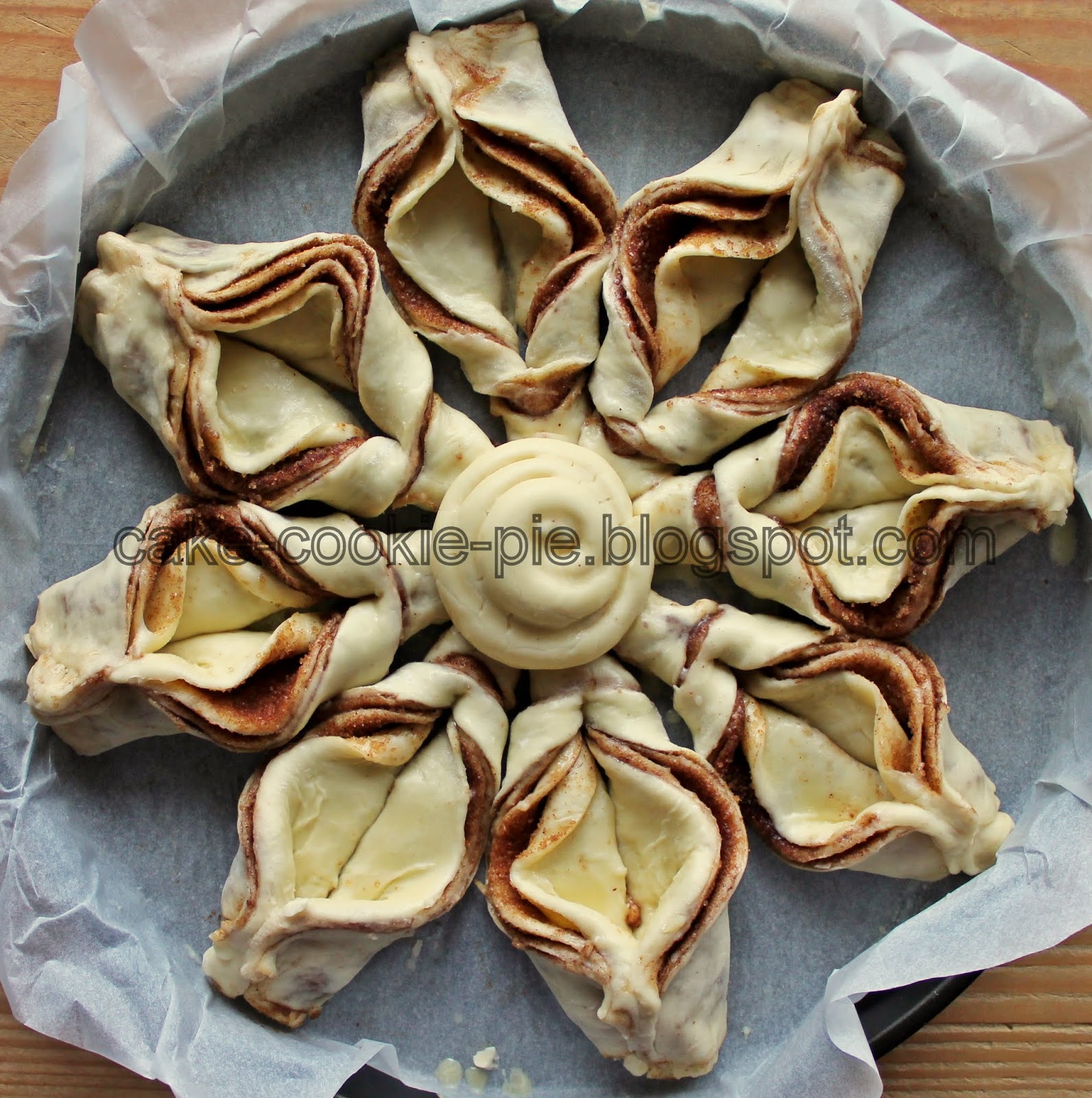 Položite jedan razvaljani krug na papir za pečenje. Premažite tijesto maslacem pa ravnomjerno pospite trećinom mješavine šećera i cimeta. Na to stavite drugi krug tijesta, premažite ga maslacem i pospite trećinom mješavine šećera i cimeta. Stavite treći krug tijesta, premažite maslacem i pospite ostatkom mješavine šećera i cimeta. Položite posljednji krug tijesta i premažite maslacem. Tijesto podijelite na 8 jednakih trokuta. Na svakom trokutu po sredini napravite rez 2/3 od ruba (rez ne smije doći do baze ili vrha trokuta, već samo po središnjem dijelu). Vrh svakog trokuta provucite kroz rez, odozgora prema dolje. Trokute poslažite na lim obložen papirom za pečenje. Vrhove trokuta spojite u sredini. Od ostatka tijesta razvaljajte dugački valjak, kojeg smotajte u pužić i stavite na sredinu, tako da pokrijete vrhove trokuta. Premažite tijesto mješavinom mlijeka i šećera (nisam iskoristila svu količinu mlijeka, možda je ostalo pola). Pustite da tijesto odmori 15 minuta, a za to vrijeme zagrijte pećnicu na 240°C. Pecite 5 minuta u pećnici zagrijanoj na 240°C, a zatim smanjite temperaturu na 200°C i nastavite peći još 15-20 minuta dok tijesto ne poprimi lijepu boju. Kada je pečeno, izvadite iz pećnice i ohladite na rešetki (mada pretpostavljam da nećete odoljeti mirisu, pa ćete navaliti dok je još toplo).