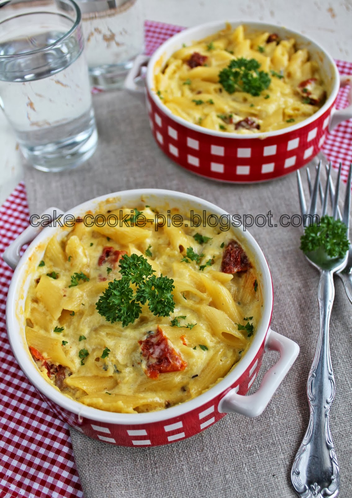 Tjesteninu prelijte mlijekom, pokrijte prijanjajućom folijom i ostavite u frižideru minimalno dva sata (recept sam do sada radila dva puta - jednom je tjestenina bila u frižideru 5 sati, a jednom 9 i nisam osjetila razliku u okusu). Razmutite jaja, dodajte vrhnje za kuhanje i začine pa dobro promiješajte. Smjesu umiješajte u tjesteninu s mlijekom pa dodajte naribani sir i sušene pumidore. Smjesu izlijte u nauljeni keramički kalup/lim za pečenje ili napravite pojedinačne porcije u manjim kalupima. Pecite 40 minuta u pećnici zagrijanoj na 180°C. Tijekom pečenja promiješajte nekoliko puta, kako ne bi stalno ista tjestenina bila na vrhu - promiješala sam nakon 20 i nakon 35 minuta. Poslužite toplo, a odlično paše uz hrskavo pečenu pancetu (koju možete ispeći u pećnici zajedno s tjesteninom, taman u vremenu između dva miješanja).