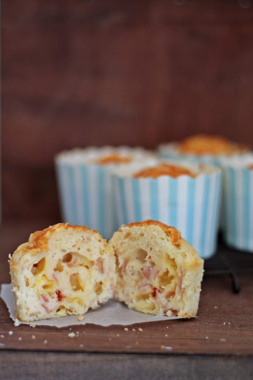 Bjelanjke izmiksajte u snijeg. U drugoj posudi miksajte žumanjke. Dodajte mlijeko i začine i promiješajte. Dodajte brašno i prašak za pecivo pa miksajte dok ne dobijete glatku smjesu. U smjesu umiješajte šunku i sir. Lagano umiješajte snijeg od bjelanjaka uz pomoć vilice (nemojte puno miješati da muffini ne budu tvrdi). Smjesu za muffine rasporedite u košarice za muffine i po vrhu pospite naribanim parmezanom. Pecite 20 - 30 minuta u pećnici zagrijanoj na 180°C. Ukoliko koristite kartonske muffine (kao ja) vrijeme pečenja će biti nešto duže, jer u njih ide više smjese. Ukoliko koristite papirnate košarice, 20 minuta pečenja bi trebalo biti dovoljno. Provjerite čačkalicom ako su pečeni. Pečene muffine pustite da se ohlade na rešetki.
